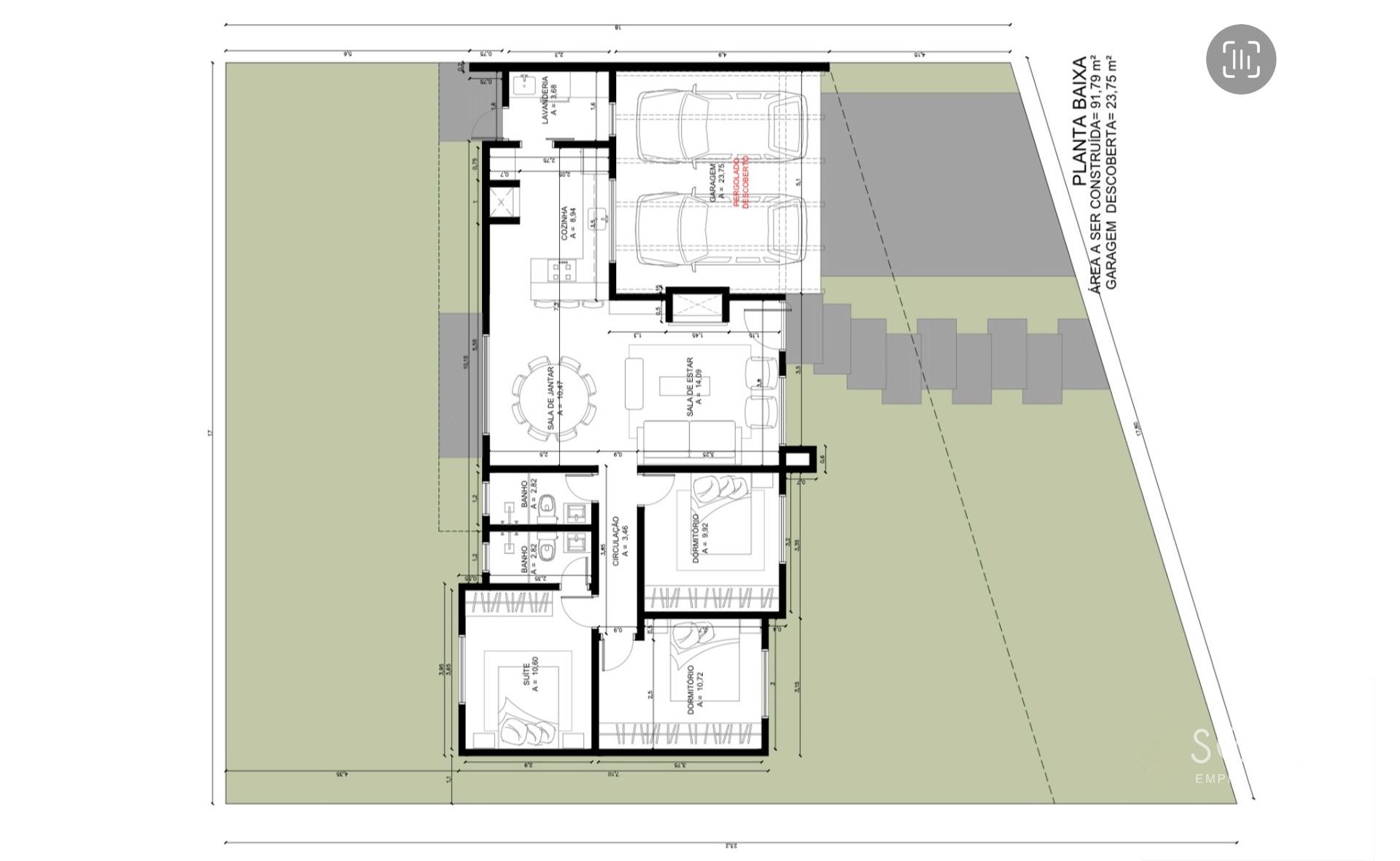 Casa individual com 91,79 m² + 23,75 m² garagem descoberta, composta por: