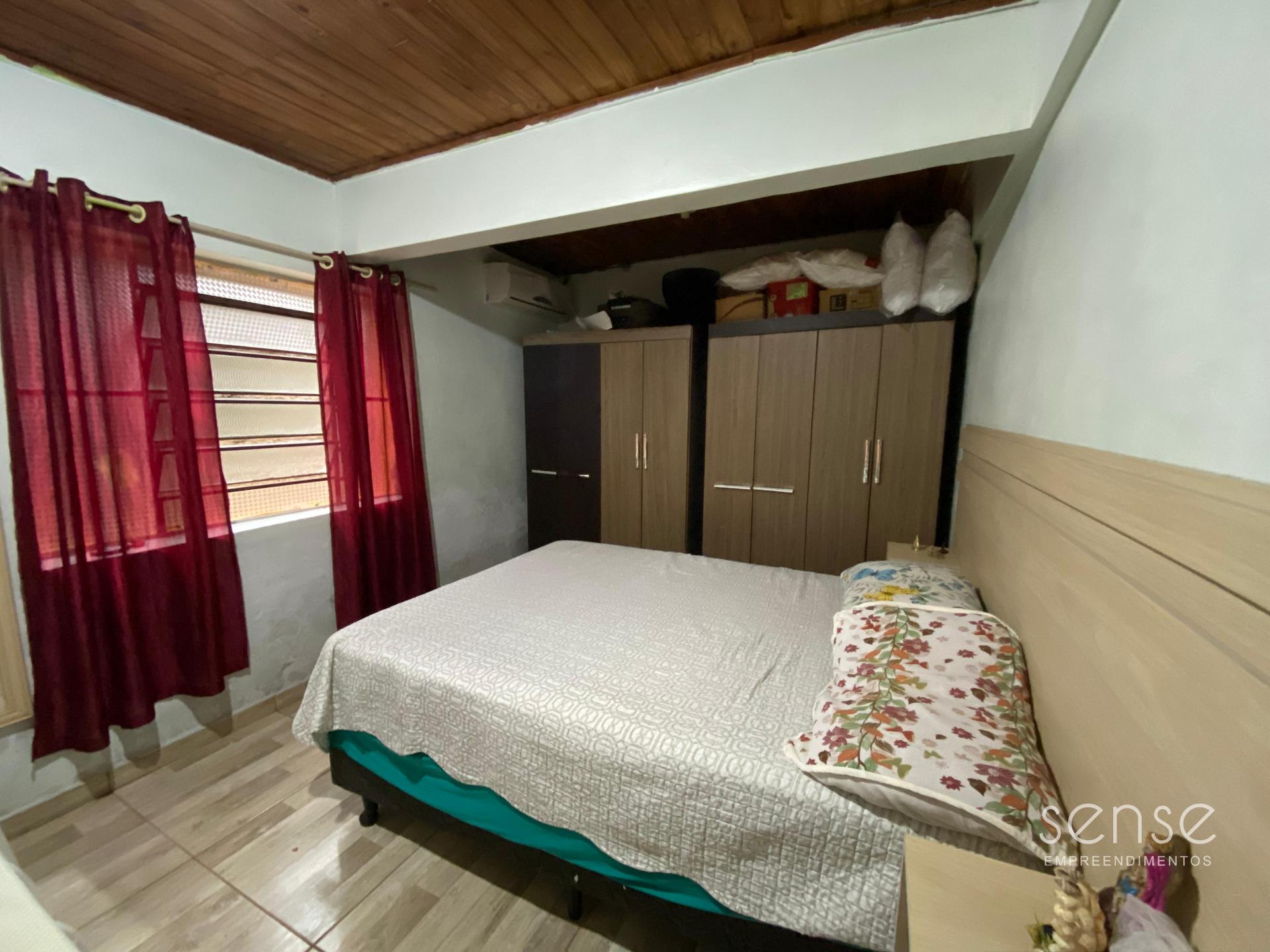 A parte inferior de alvenaria, possui 2 dormitórios, sala, cozinha com fogão campeiro, varanda com churrasqueira e depósito.